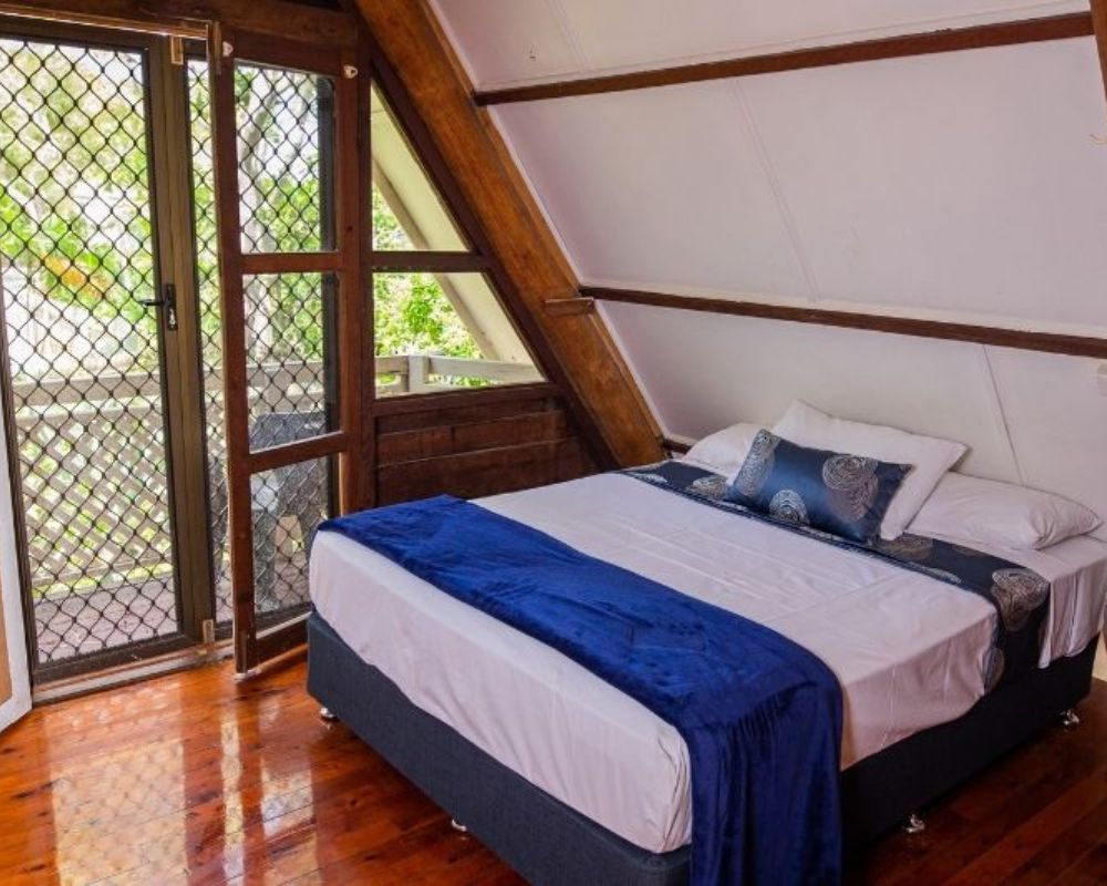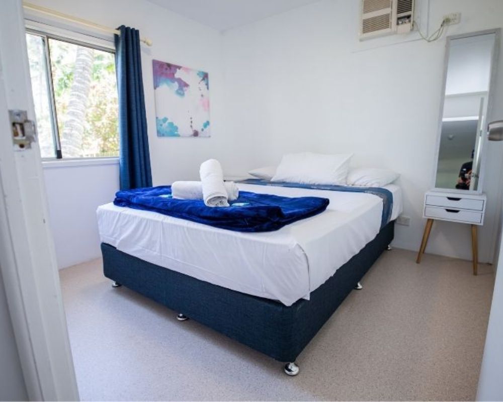 Room layouts vary and include either a queen bed, queen + single, or queen + bunk (or two singles). Linen and bath towels are provided—just bring your beach towel. Toiletries are not supplied, except for a cake of soap.