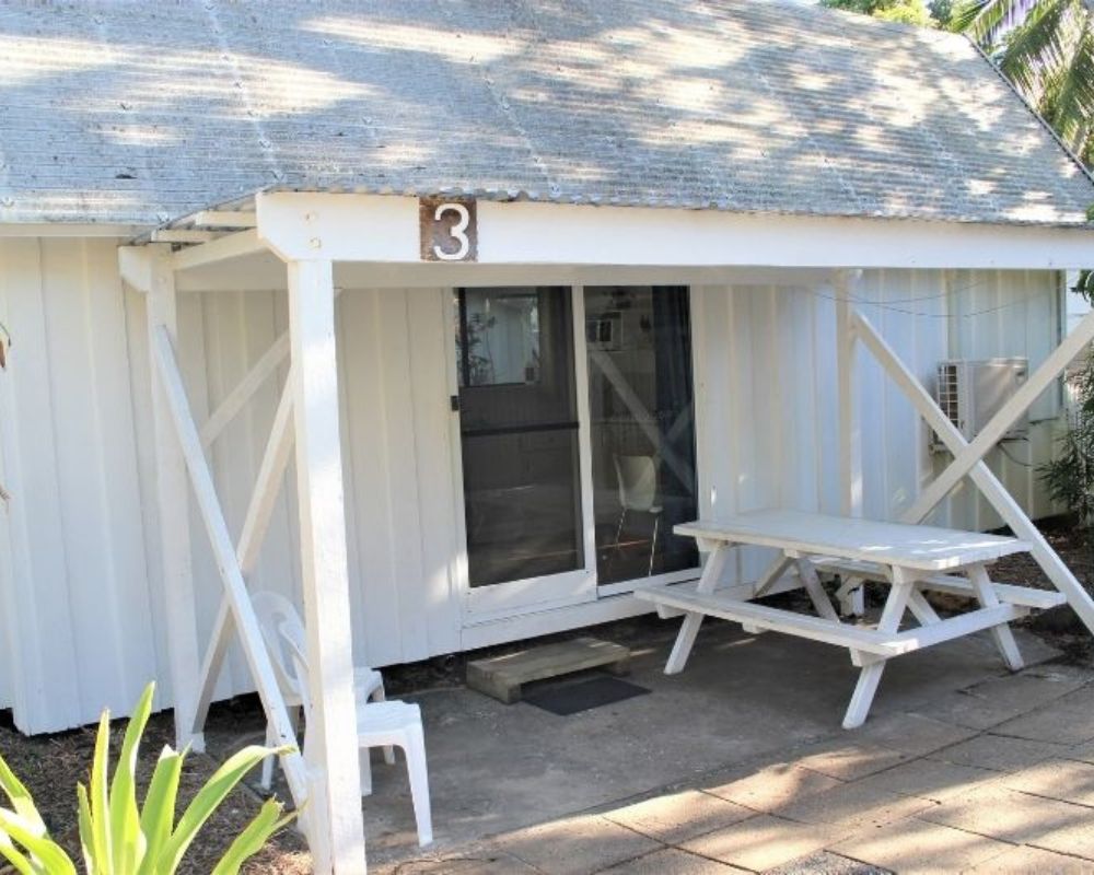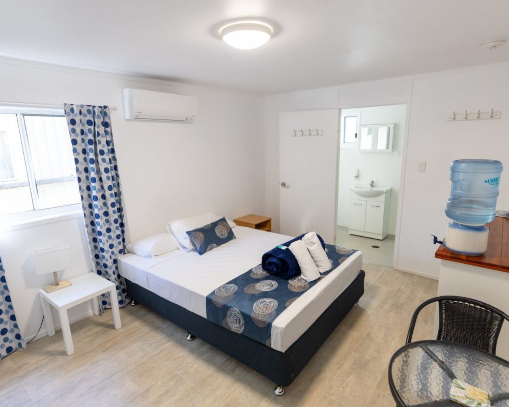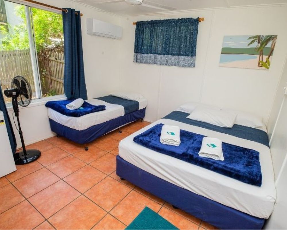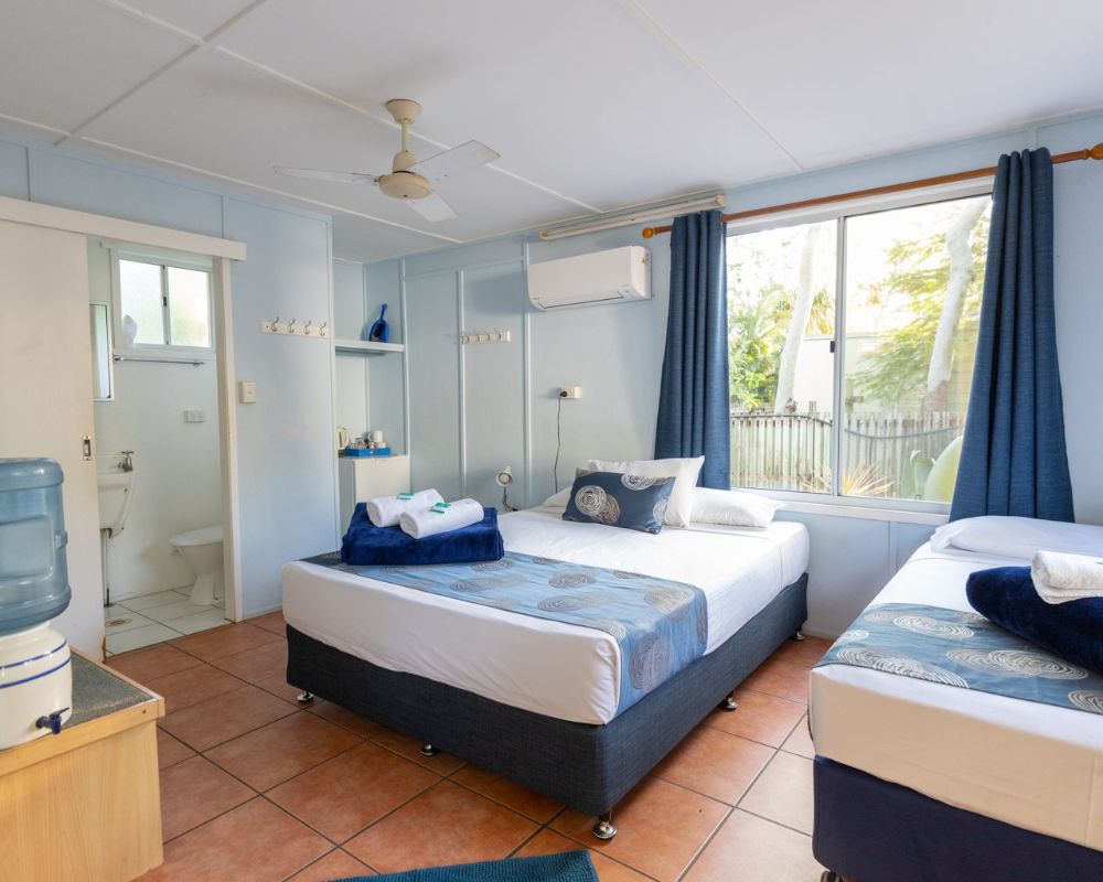 Island Cabins provide comfortable, air-conditioned accommodation with basic self-catering facilities, including a full-sized fridge-freezer, toaster, kettle, microwave, electric frypan, and dining area. Each cabin features a private ensuite with shower, toilet, and basin, plus bath towels for your stay (please bring your own beach towel). Toiletries are not provided, except for a cake of soap.