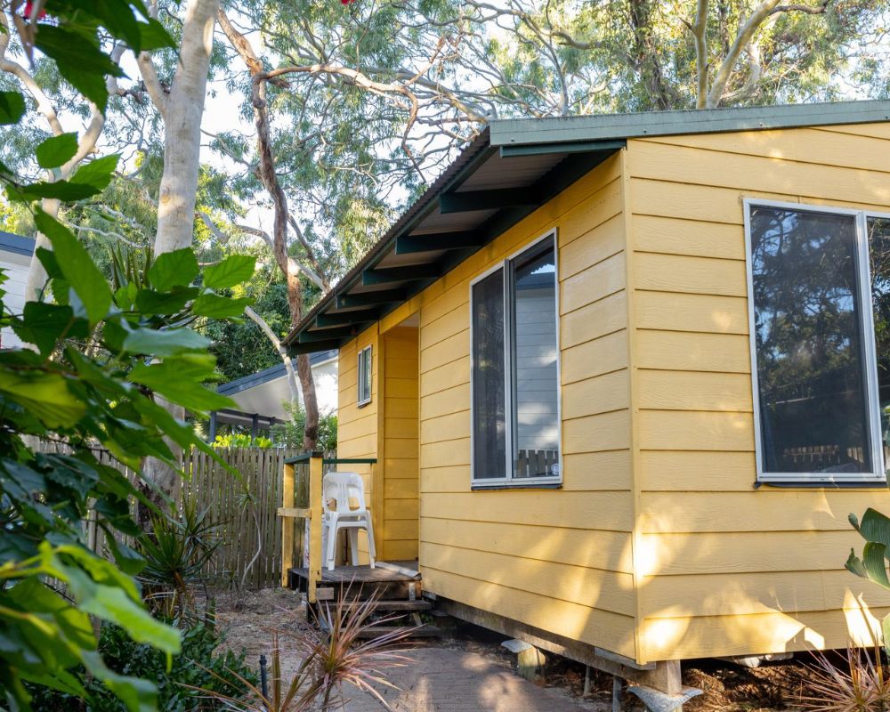 Each cabin includes basic self-catering facilities—fridge-freezer, toaster, kettle, microwave, electric frypan, and dining space—plus a private ensuite with shower and basin. All are air-conditioned and benefit from cooling sea breezes year-round.