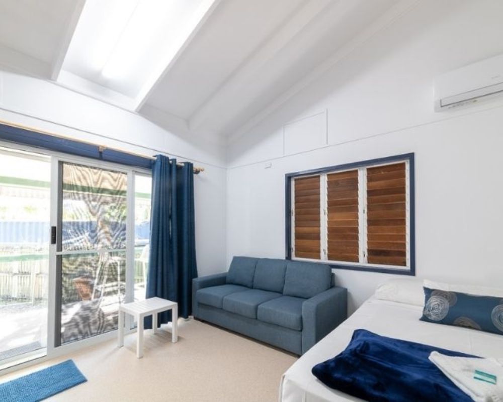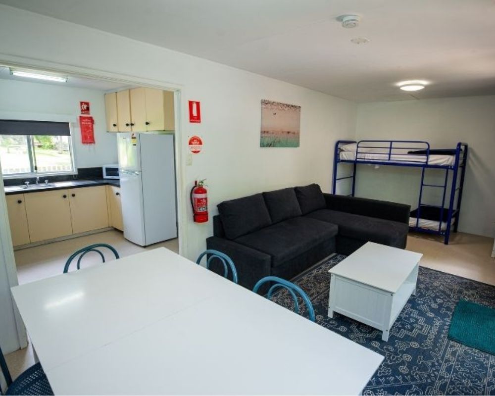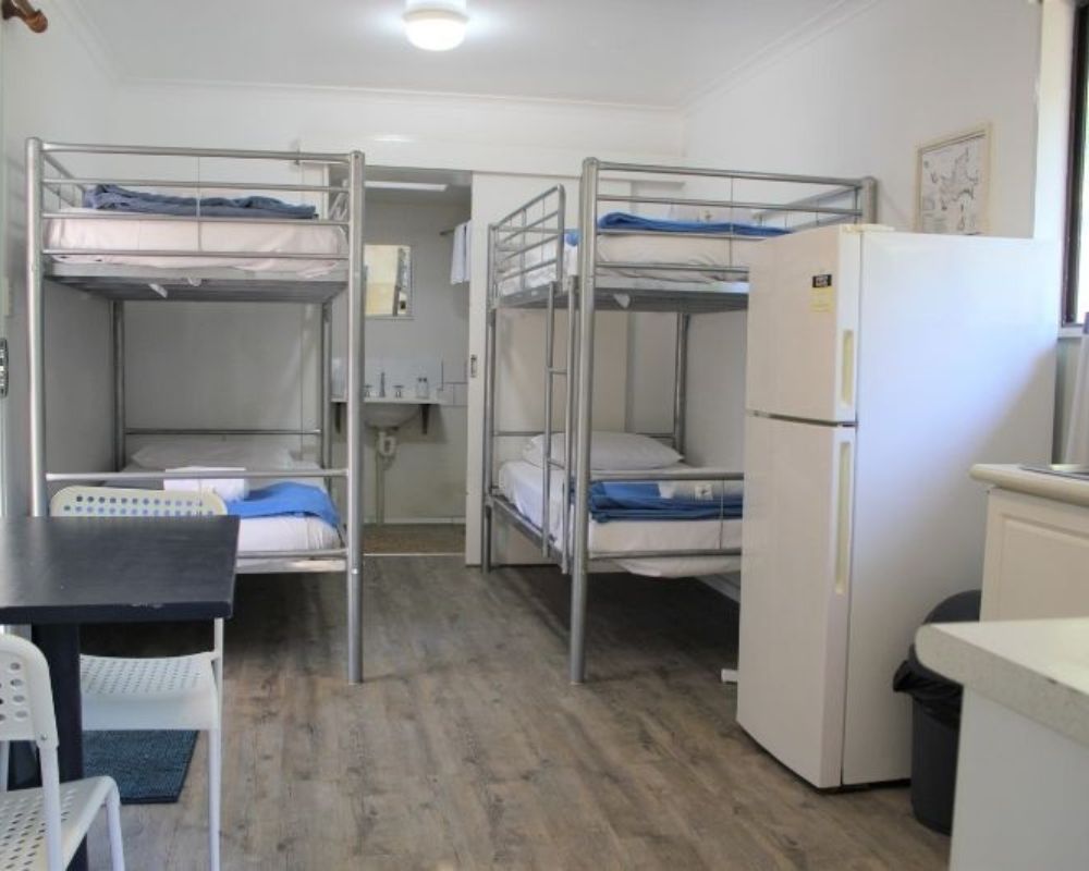Cabins include a separate queen bedroom and typically two single beds in the main living area. Two larger cabins with two sets of bunks are available for families—contact reception to book.
